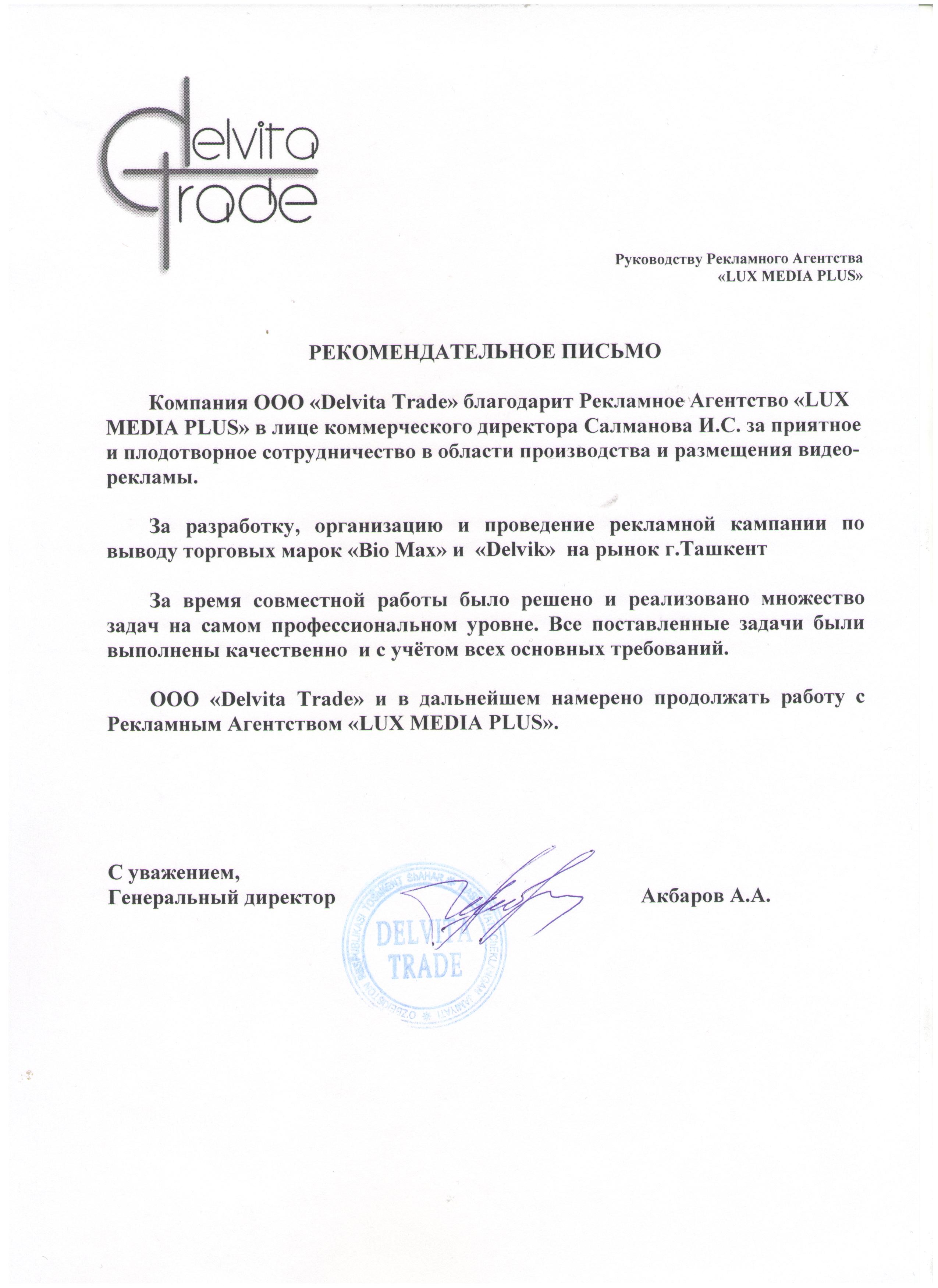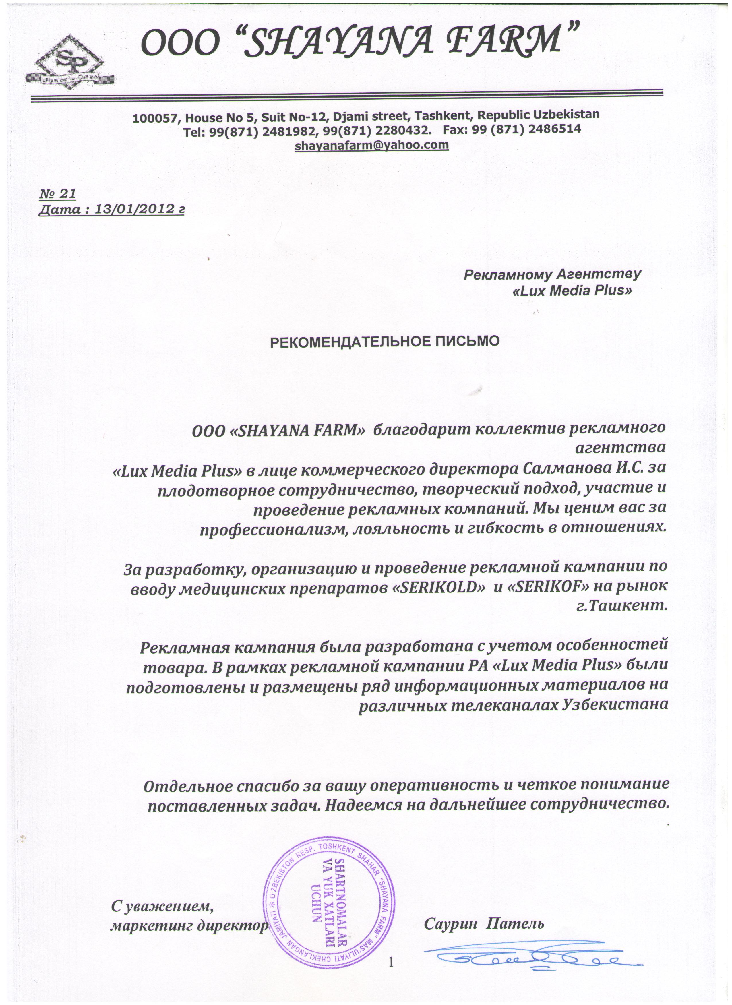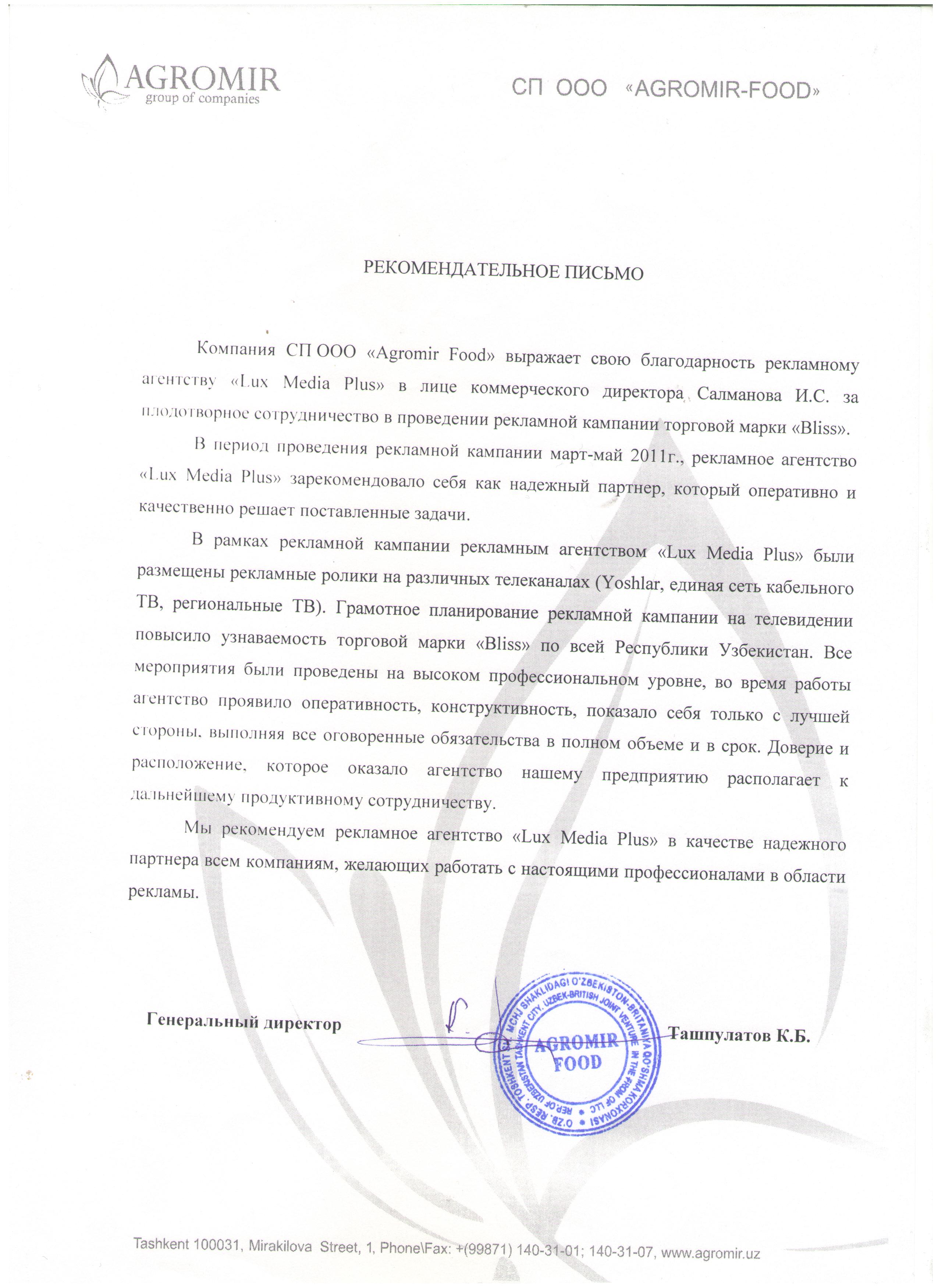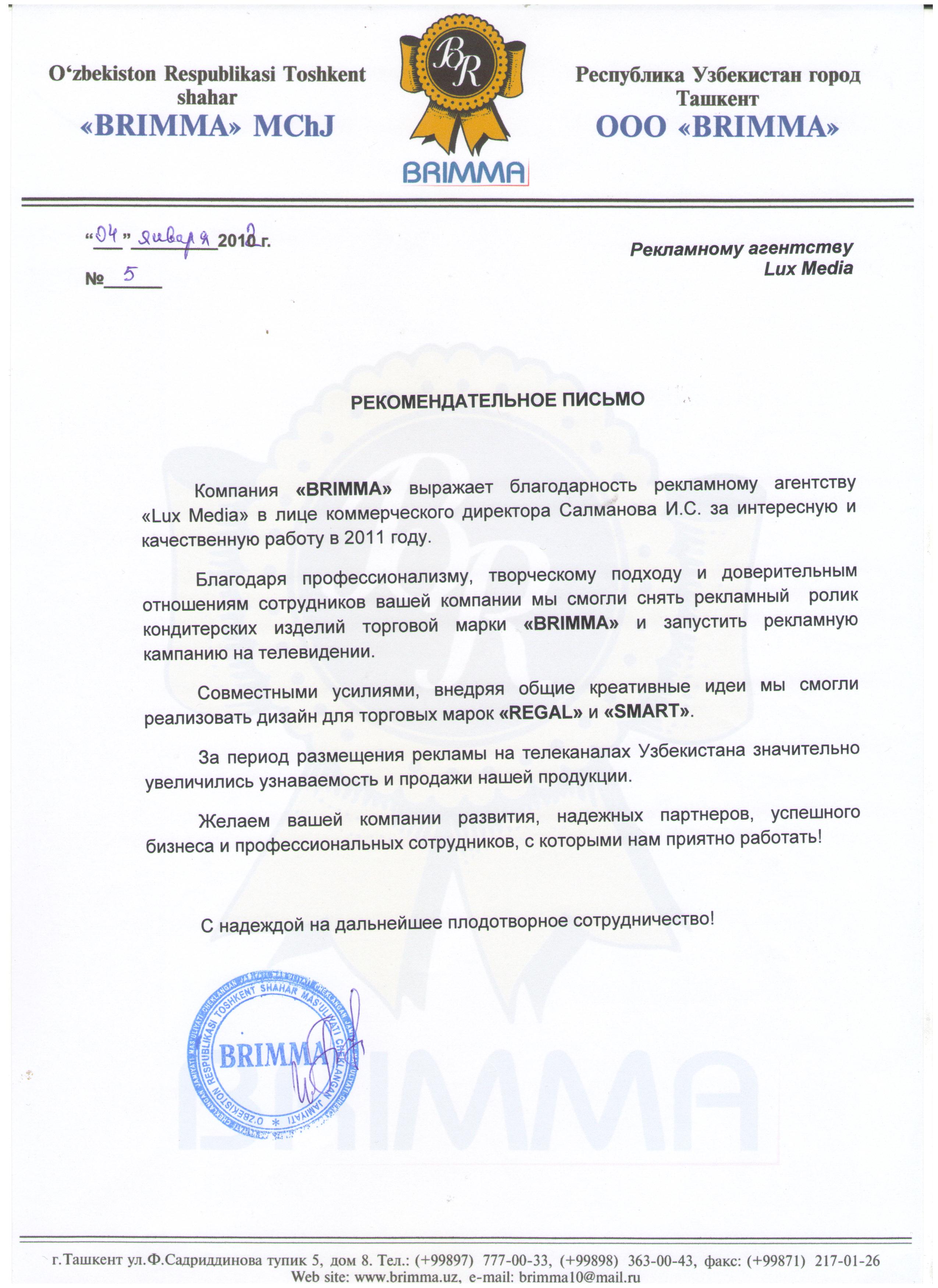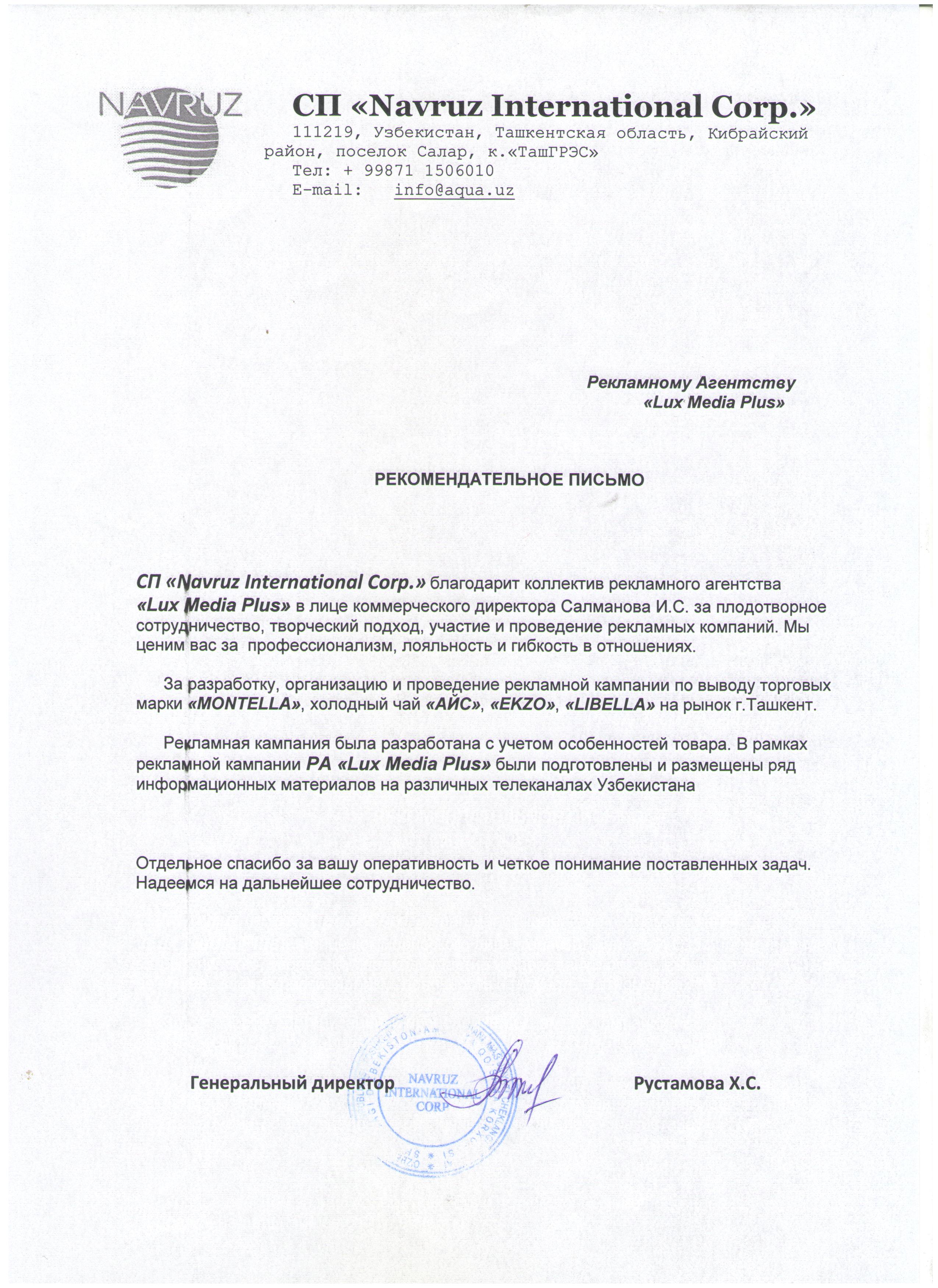 Лидирующее рекламное агентство, предоставляющее услуги по размещению рекламы на телеканалах (Узбекистон ТВ, Узбекистон 24, Ёшлар ТВ, Кинотеатр ТВ, Наво ТВ , ZOR TV, MY5, Sevimli TV, Milliy TV, Uzcable TV, UzDigital TV и региональные ТВ ) и радиостанциях (Эхо Долины, Хамрох, Ориат ФМ, Ориат Доно, Узбегим таронаси, Пойтахт, Maxima, Nostalgie, Гранд, Рухсор )