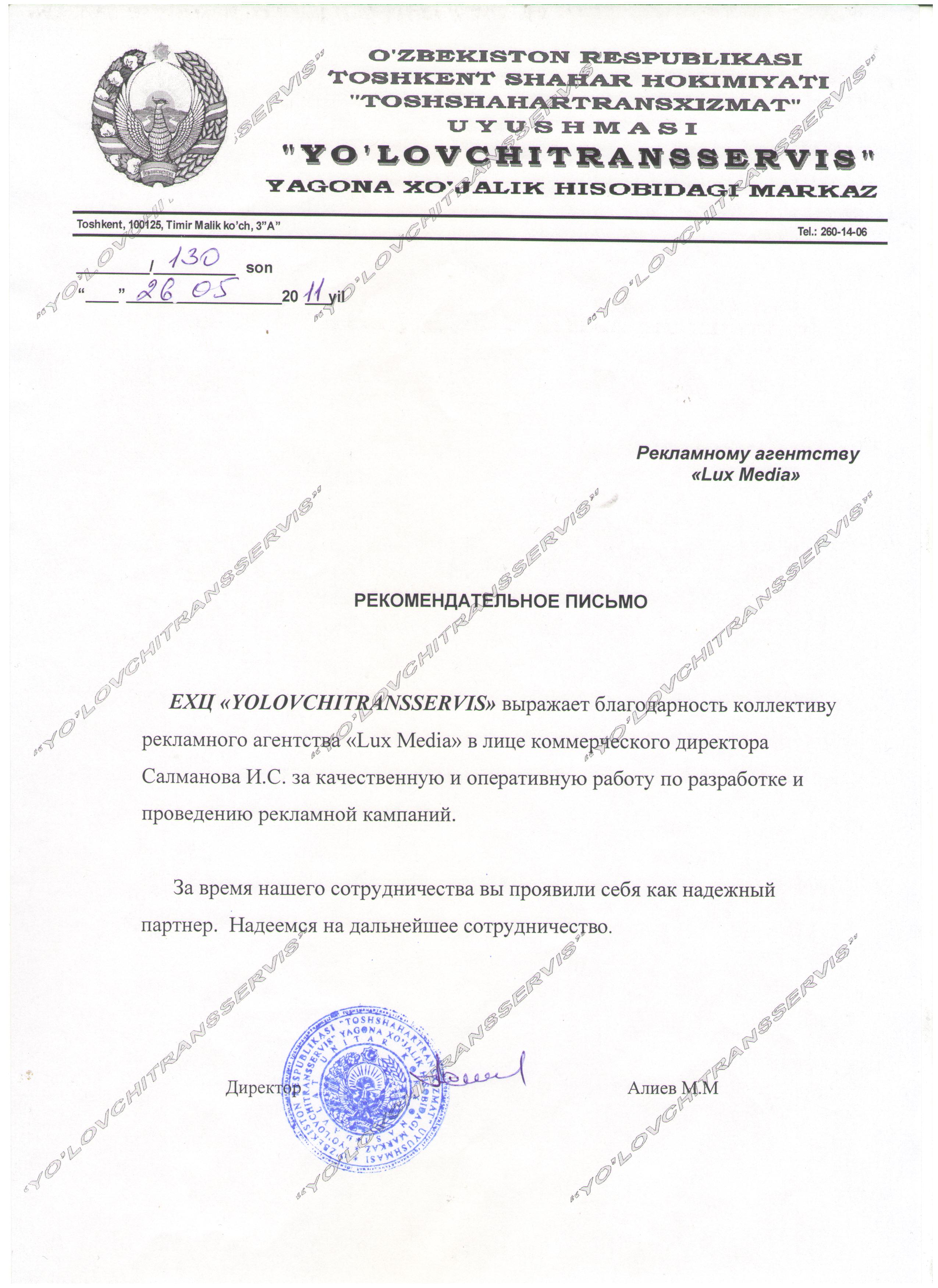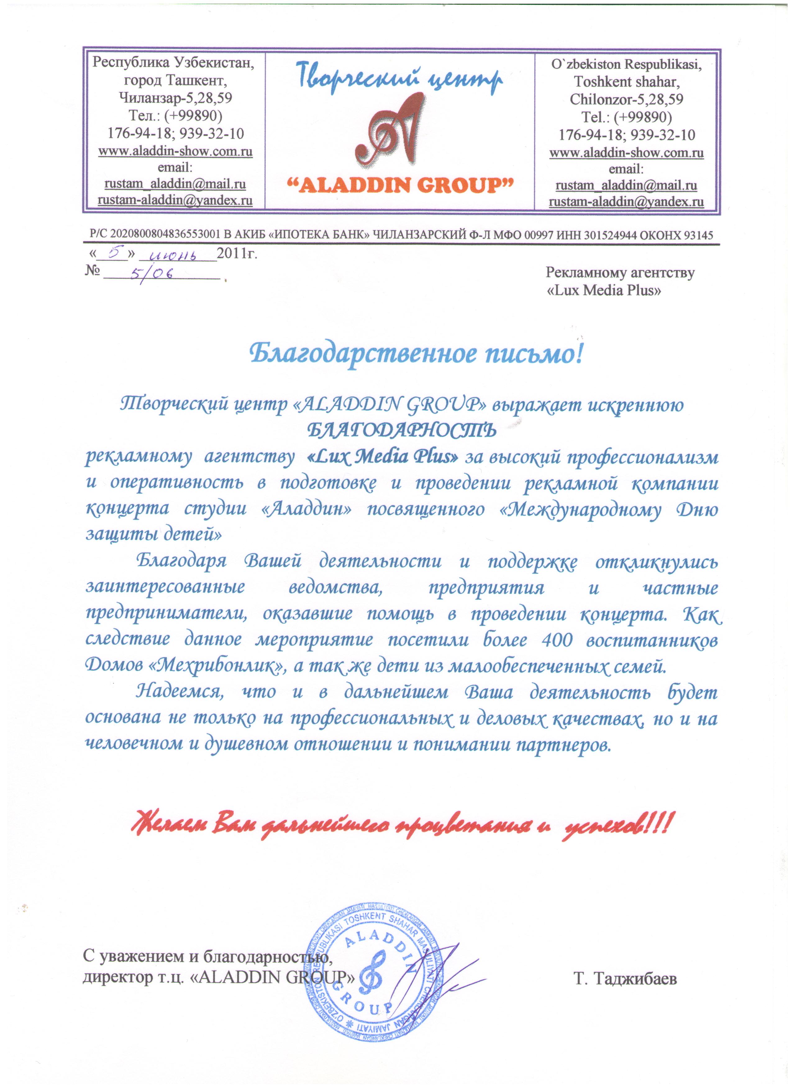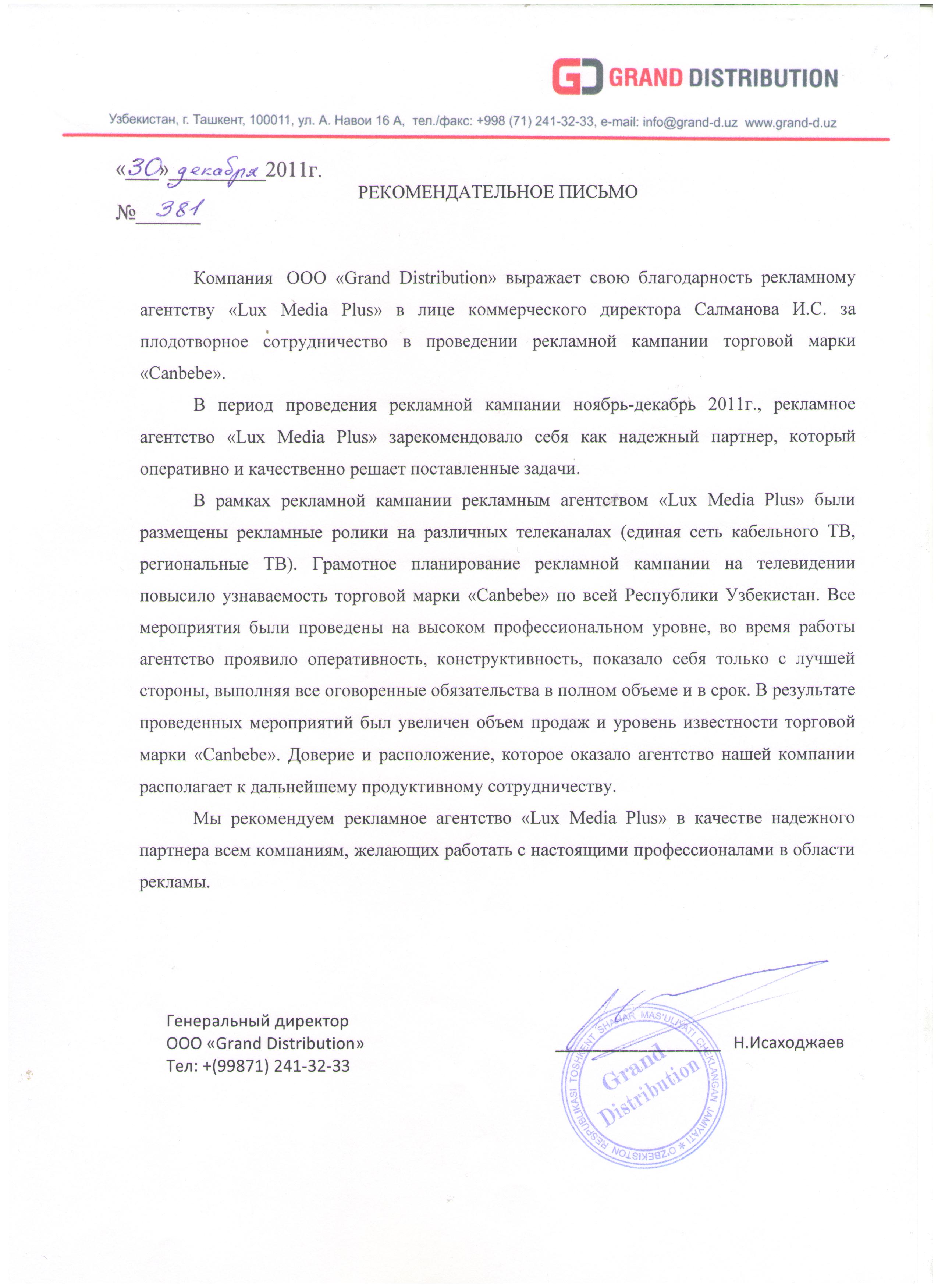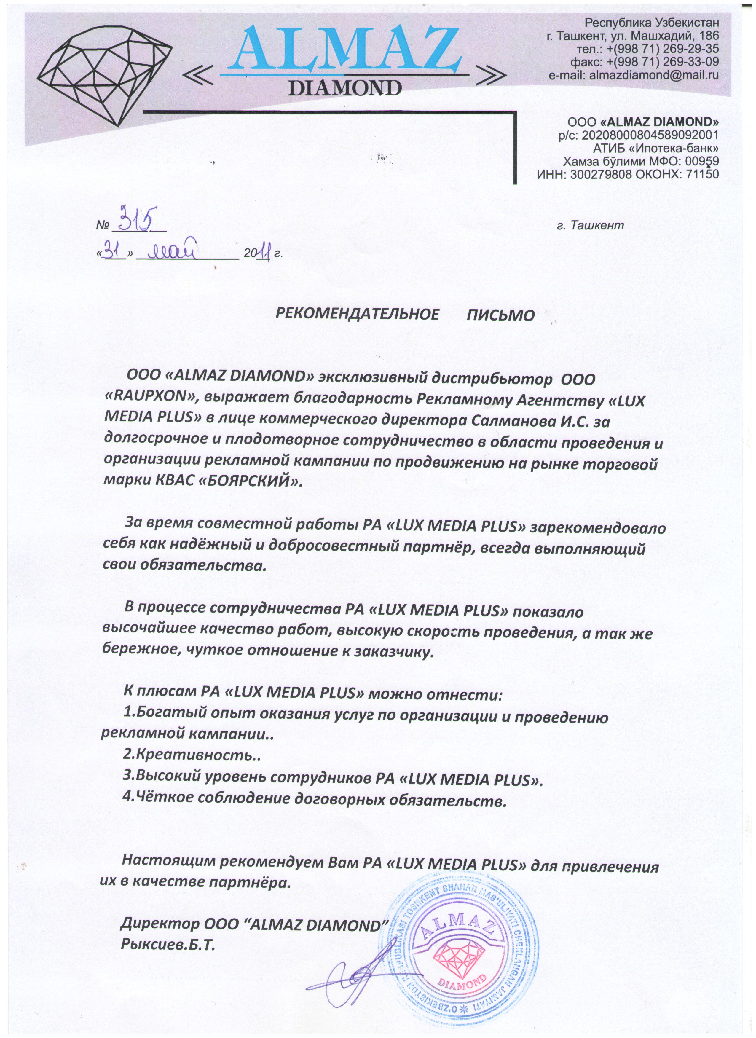 Лидирующее рекламное агентство, предоставляющее услуги по размещению рекламы на телеканалах (Узбекистон ТВ, Узбекистон 24, Ёшлар ТВ, Кинотеатр ТВ, Наво ТВ , ZOR TV, MY5, Sevimli TV, Milliy TV, Uzcable TV, UzDigital TV и региональные ТВ ) и радиостанциях (Эхо Долины, Хамрох, Ориат ФМ, Ориат Доно, Узбегим таронаси, Пойтахт, Maxima, Nostalgie, Гранд, Рухсор )